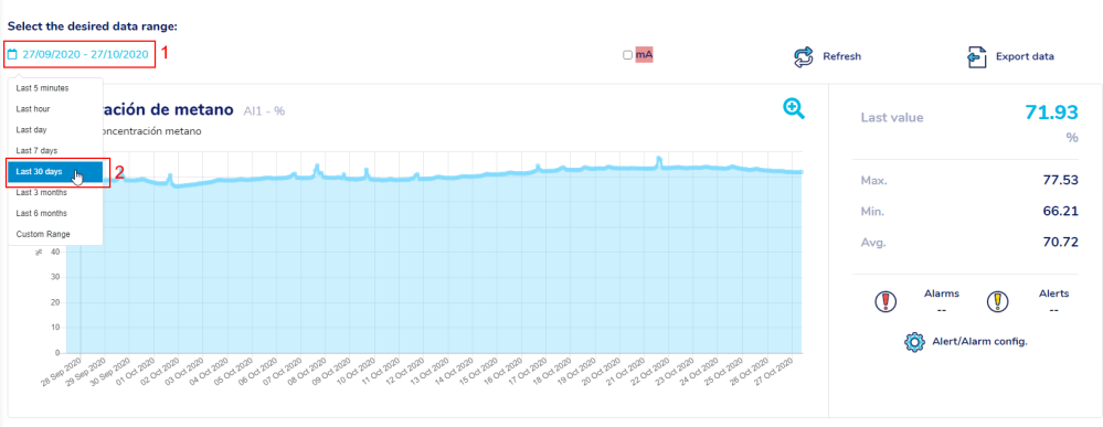 If we click on it, we can choose the time period of data visualization (last 24 hours, last week, etc.).