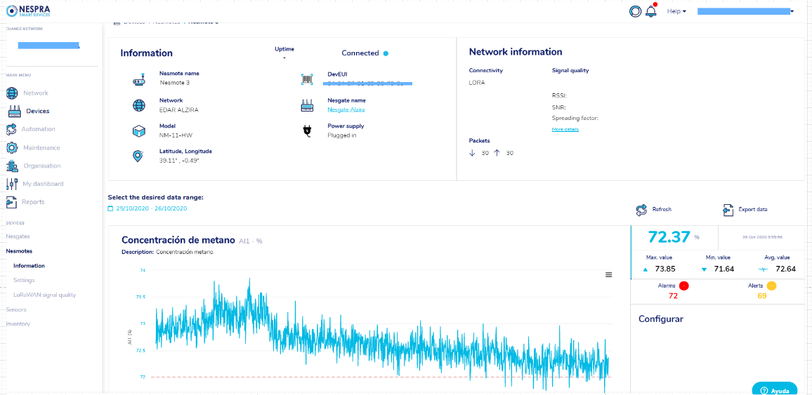 When clicked, we will be redirected to a screen with the specific information of the Nesmote and with the graphs that show the data of the sensors. We can see the temporal evolution of the data in the graph and on the right we also have the last value and the maximum, minimum and average values. Below "Select desired data range" is a time interval selector.