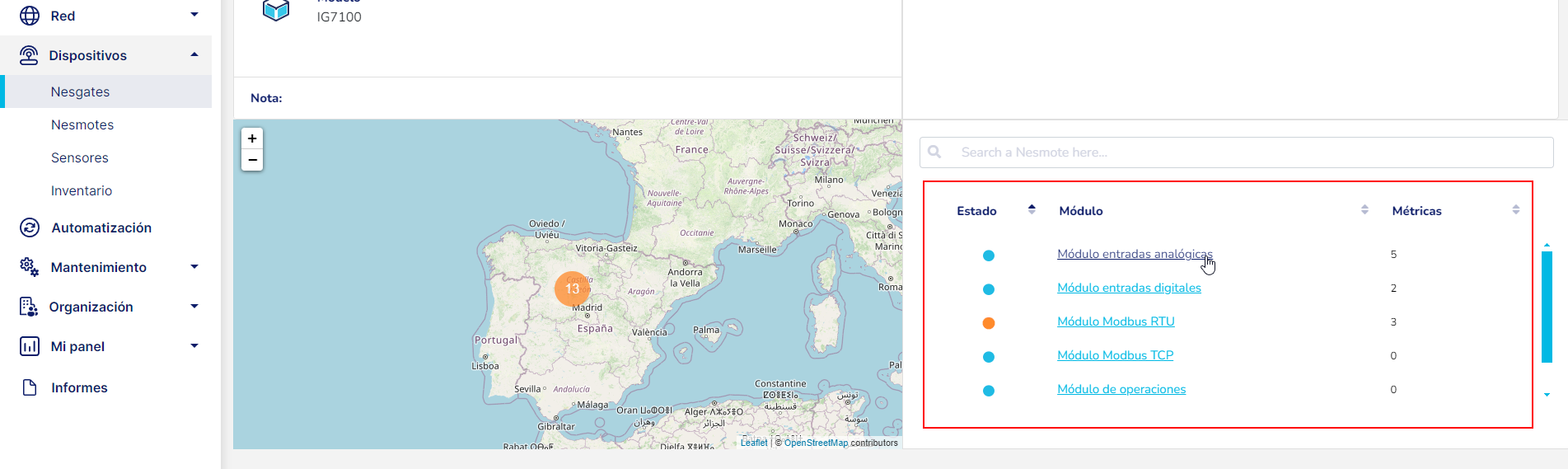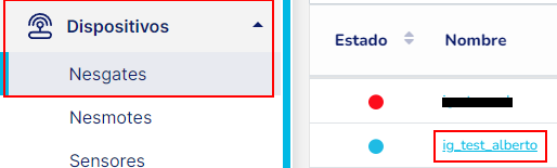 De cara a visualizar la información de los sensores de un módulo del Industrial Gateway, primero debes dirigirte a la página que contiene la tabla con la lista de Nesgates y una vez en esta, hacer clic en el nombre del Industrial Gateway.