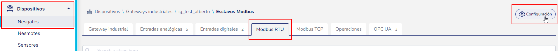 Para configurar el módulo de Modbus RTU, primero debes dirigirte a la página que contiene la tabla con la lista de Nesgates y una vez en esta, hacer clic en el nombre del Industrial Gateway tal como se ve en la imagen inferior: