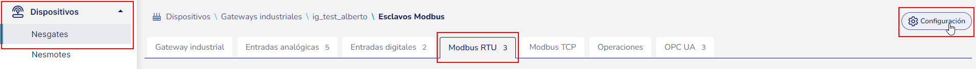 Para configurar el módulo de Modbus RTU, primero debes dirigirte a la página que contiene la tabla con la lista de Nesgates y una vez en esta, hacer clic en el nombre del Industrial Gateway. En la siguiente imagen se detalla como hacerlo: