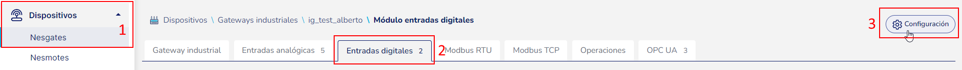 Para configurar un IG y hacer que sensores de este envíen datos cuando una señal del módulo de entradas digitales cambia de valor, deberemos dirigirnos a la configuración del módulo de entradas digitales del IG: