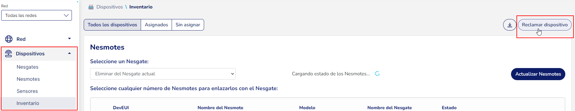 Primero hay que hacer clic en "Dispositivos", luego en "Inventario" y finalmente en el botón de "Reclamar dispositivo".