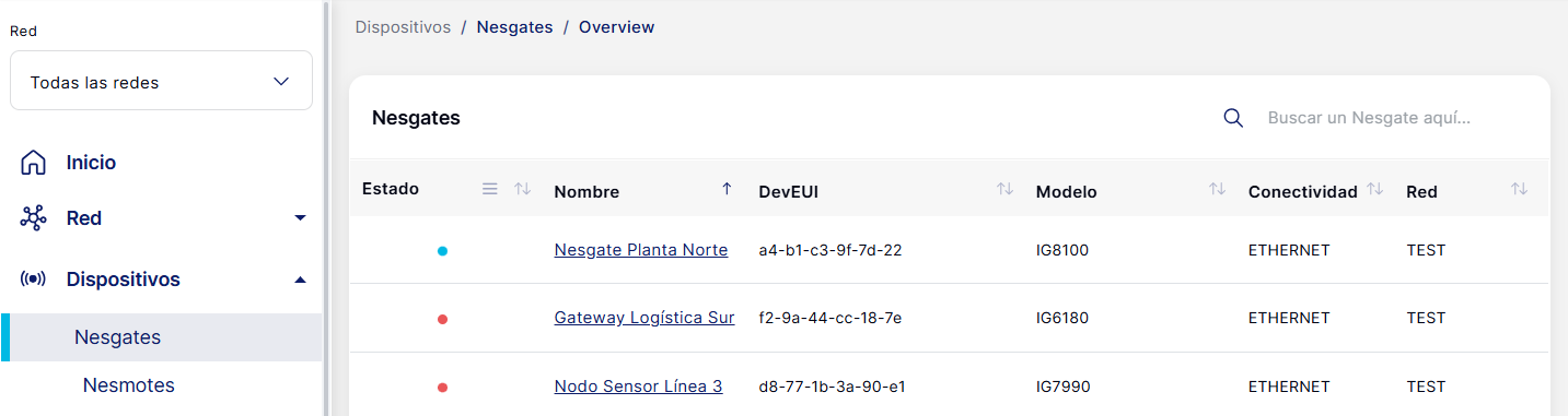 En esta pantalla verás el listado de Nesgates vinculados a tu organización, junto con información básica de cada uno.