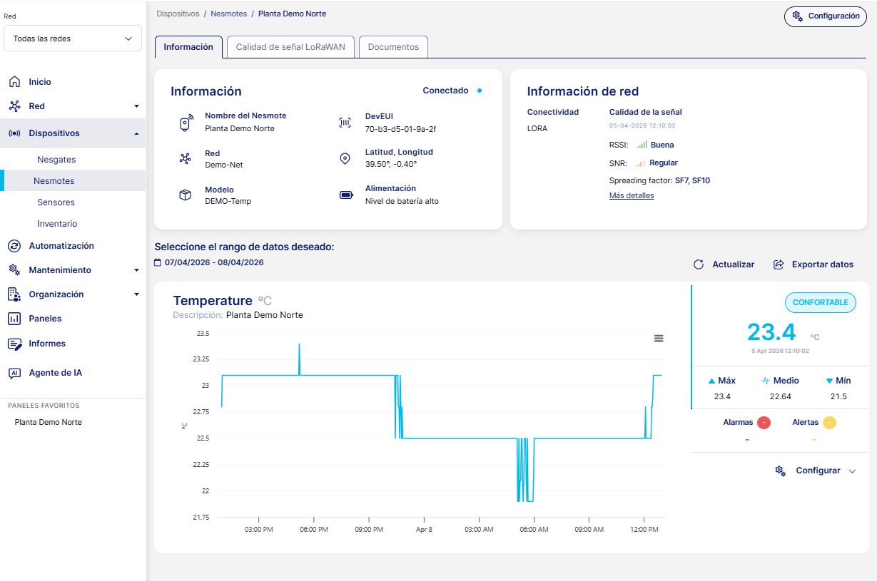 Desde la pantalla de detalle podrás ver la información del dispositivo y los sensores asociados.