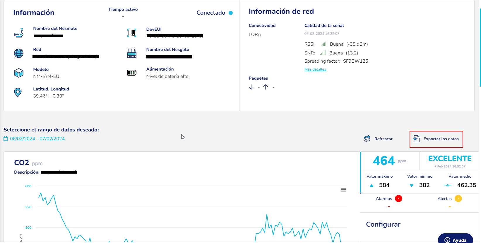 Al hacer clic se nos redirigirá a la pantalla con la información de los sensores. En esta página deberemos hacer clic en "Exportar datos" tal como se puede observar en la siguiente imagen: