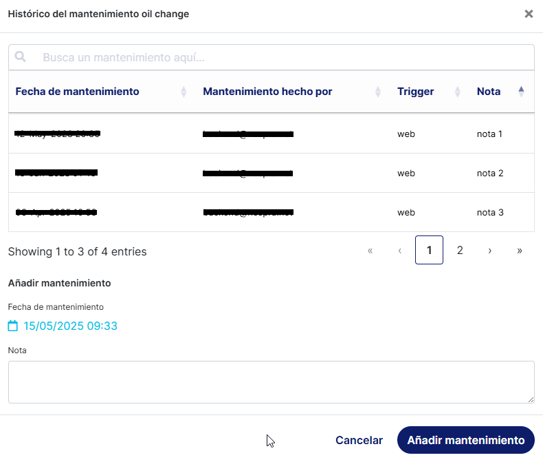 Registrar cuándo se ha realizado un nuevo mantenimiento.