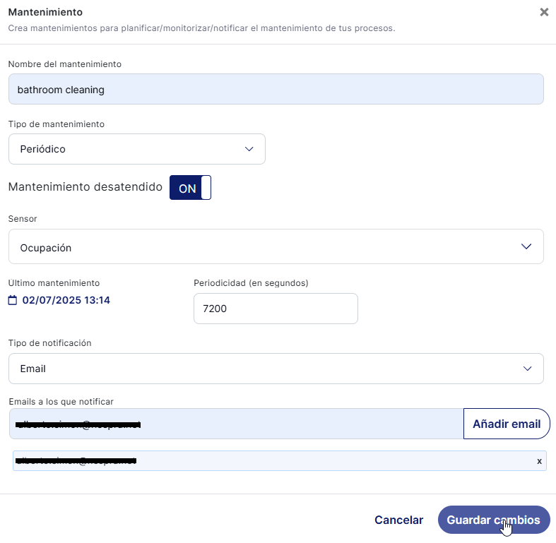 Cuando hayas terminado, haz clic en Guardar cambios para crear el mantenimiento.