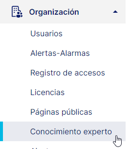 Para crear una plantilla de conocimiento experto y aplicarla masivamente a todos los sensores del mismo tipo de nuestra organización, debes dirigirte al menú de "Organización" y hacer clic en "Conocimiento experto". Este proceso se puede ver en la siguiente imagen: